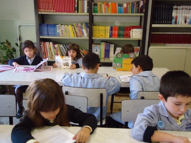 Los alumnos de 1º de Infantil es la primera vez que celebran el día del libro en este cole. Aún no saben leer, pero han estado viendo los dibujos de los cuentos y se lo han pasado en grande en la biblioteca del piso de arriba.