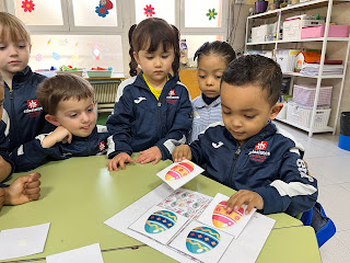 Continuamos con más juegos de Pascua por el aula de 1º de Infantil. Hoy ha tocado buscar parejas de huevos de Pascua y completar otros con la otra mitad del huevo. Los peques se lo han pasado muy bien jugando y alegrándose cuando algún compañero encontraba una pareja.
